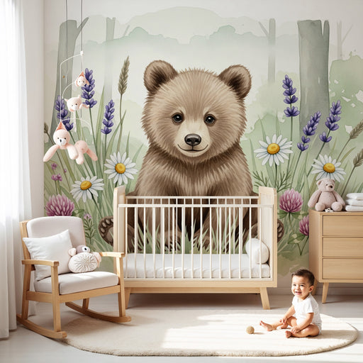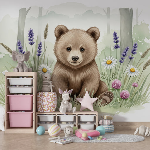 KidsWallTransformér dit barns værelse med denne børnetapet, der viser en sød bjørn, der stiger op fra smukke pastelfarvede blomster. Dette charmerende desi...