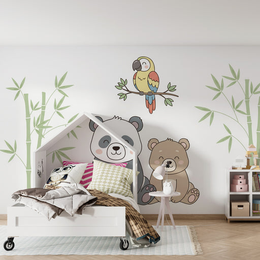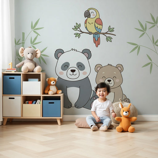 KidsWallTransformér dit barns værelse med denne børneværelse tapet der viser to søde bjørne og en farverig papegøje. Bjørnene, den ene som en panda og den ...