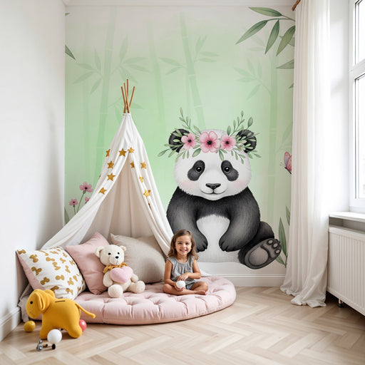 KidsWallRedecorer dit barns værelse med denne børneværelse tapet med en sød panda foran en tipi. Omgivet af frodige planter indbyder dette fortryllende dek...