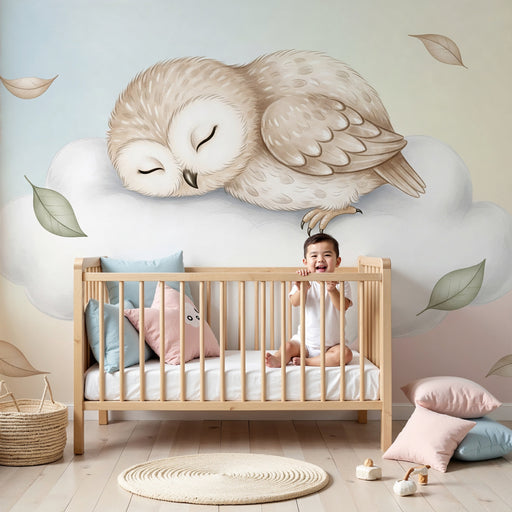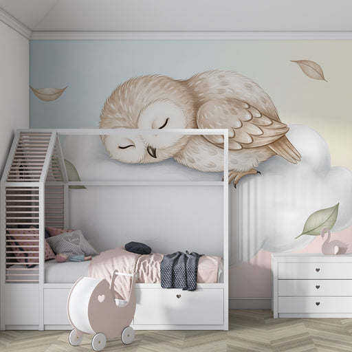 KidsWallDyk ned i en blød og beroligende verden med denne børneværelse tapet, der viser en sød ugle, der sover på en blød sky. I afslappende pastelfarver s...