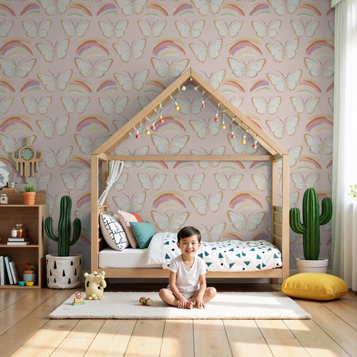 KidsWallForvandl dit barns værelse til et drømmende rum med denne tapet fyldt med sommerfugle og bløde regnbuer. De delikate mønstre og farmonien i farvern...