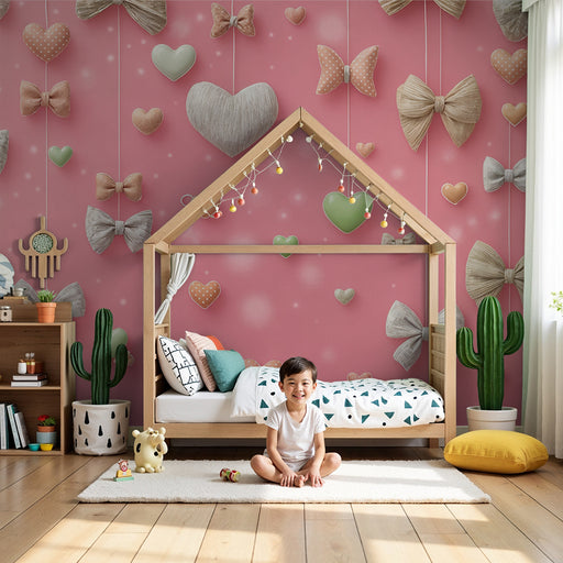 KidsWallTilføj et strejf af romantik til dit hjem med vores sløjfe og hjerte tapet. Denne lyserøde baggrund er fyldt med smukke sløjfer i forskellige størr...