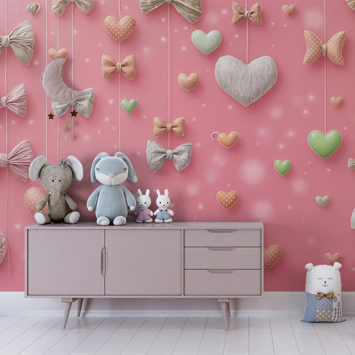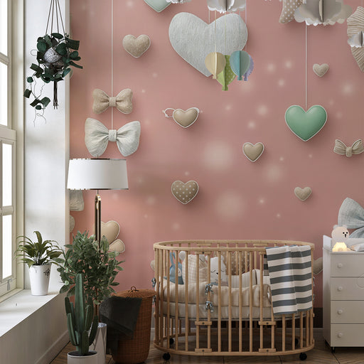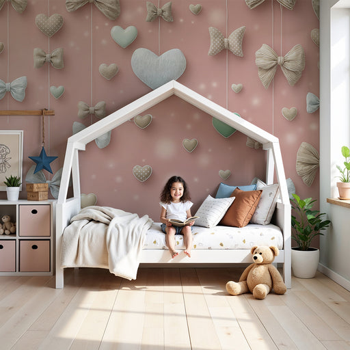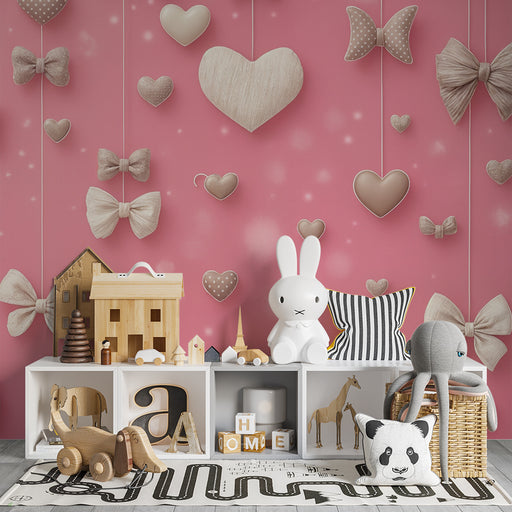 KidsWallOplev vores tapet med romantisk design, spredt med bånd og hjerter på en blød lyserød baggrund. Perfekt til at skabe en varm og indbydende stemning...