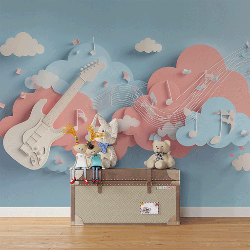 KidsWallPynt dit rum med vores musik tapet, der viser en stiliseret guitar omgivet af lyserøde og blå skyer. Musiknoter og melodiske linjer tilføjer en kun...