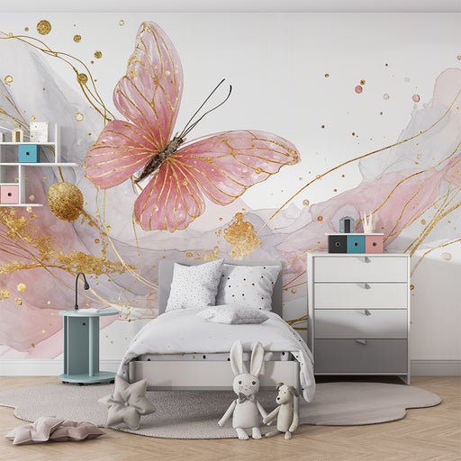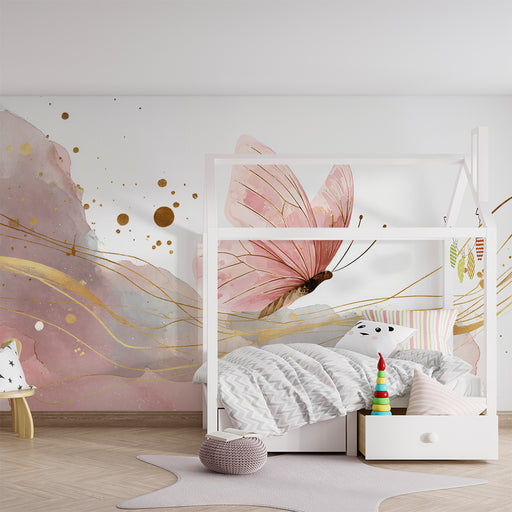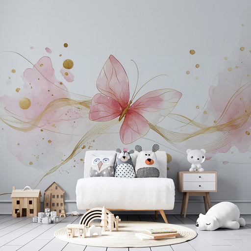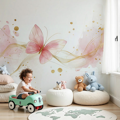 KidsWallDette sommerfugle tapet har et smukt design med en delikat lyserød sommerfugl prydet med gyldne streger, der svæver over flydende arabesker. De lys...