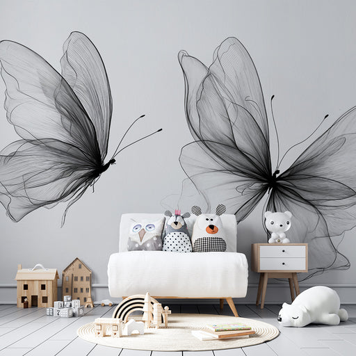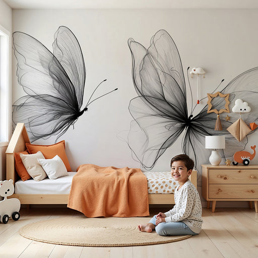 KidsWallOplev vores delikate sommerfugletapet, perfekt til at tilføje en let og yndefuld touch til dit hjem. De fint tegnede sommerfugle i monokrom stil br...