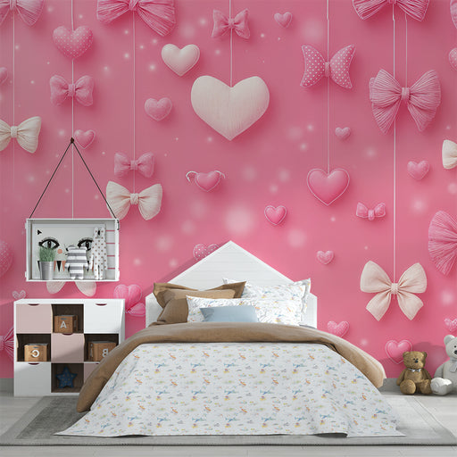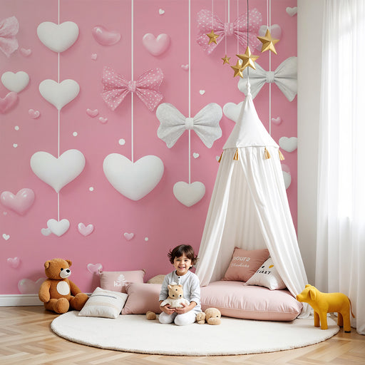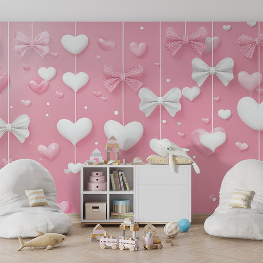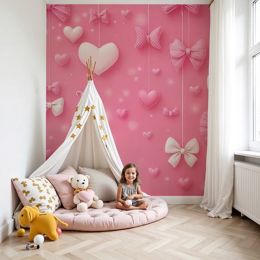KidsWallBring en kærlig og charmerende stemning til dit hjem med vores romantiske tapet, dekoreret med lyserøde sløjfer og hjerter. Perfekt til et børnevær...