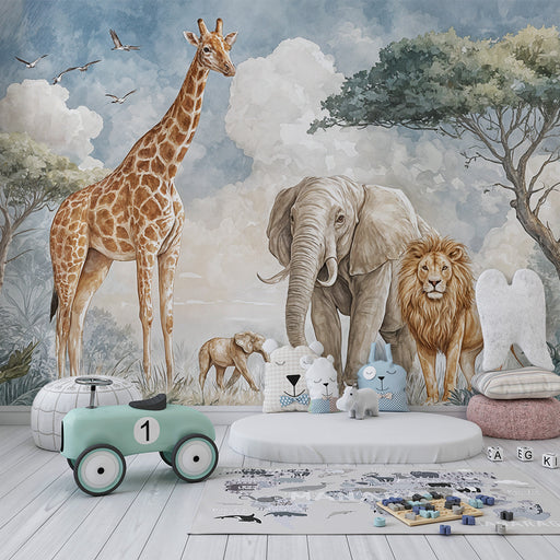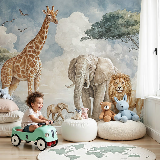 KidsWallDette dyre Safari tapet præsenterer en charmerende scene med søde dyr illustreret i akvarelstil, perfekt til at skabe en legende atmosfære på børne...