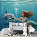 Nuancer af blå og grøn skaber en beroligende atmosfære, mens luftbobler tilføjer en legende touch. Hvert detalje, fra havfruens strålende smil til delfinens glæde, bidrager til at gøre denne undersøiske verden indbydende og fortryllende.