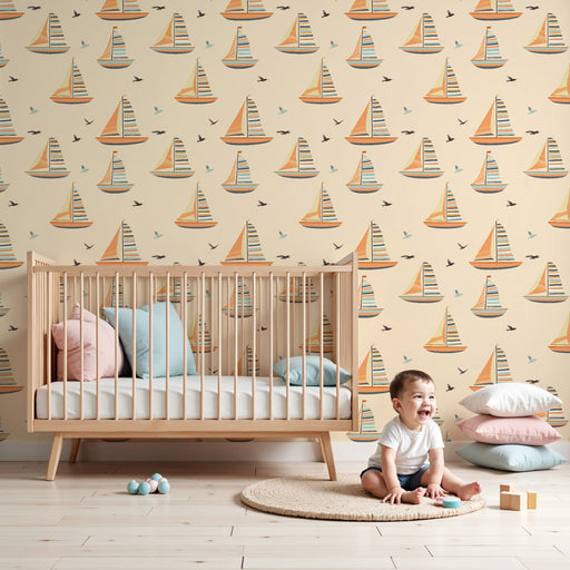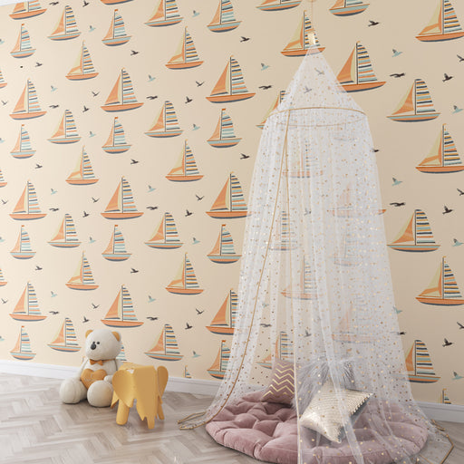 Kinderzimmer Tapete mit Muster | Bunte Segelboote auf weichem Hintergrund