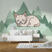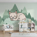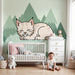 Verwandeln Sie das Zimmer Ihres Babys in einen beruhigenden Raum mit dieser Babyzimmer Tapete, die einen niedlichen schlafenden Luchs darstellt. Auf einem weichen Grasteppich eingebettet, ist diese kleine Wildkatze von stilisierten Bergen in subtilen Grüntönen umgeben, was eine ruhige und tröstliche Atmosphäre schafft.