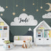 Verwandeln Sie das Zimmer Ihres Babys in eine bezaubernde Welt mit dieser Babyzimmer Tapete, die lächelnde Wolken und majestätische Berge zeigt. Auf einem beruhigenden Hintergrund fügen goldene Sterne und ein sanfter Mond diesem Traumraum einen Hauch von Magie hinzu.