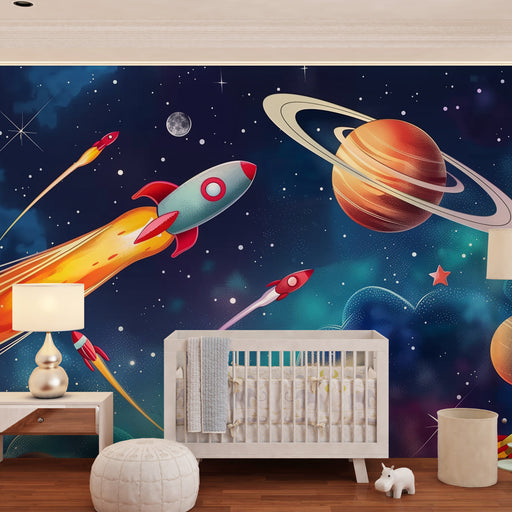 Vollständige Details anzeigenKinderzimmer Tapete | Intergalaktisches Abenteuer mit Raketen und bunten Planeten