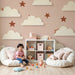 Die sanften Farbtöne und die abgerundeten Formen der Wolken und Sterne verleihen ein Gefühl von Leichtigkeit und Sanftheit und schaffen so eine entspannende Umgebung für Ihr Kleines. Jedes Element ist sorgfältig gestaltet, um die Fantasie anzuregen und gleichzeitig beruhigend zu wirken.