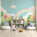 Verwandeln Sie das Zimmer Ihres Babys in eine Oase der Ruhe mit unserer pastellfarbenen Landschaftstapete mit Regenbogen. Dies bezaubernde Design zeigt zarte Bäume in sanften Farben und einen wunderschönen Regenbogen an einem hellblauen Himmel und schafft eine ruhige und fröhliche Atmosphäre.