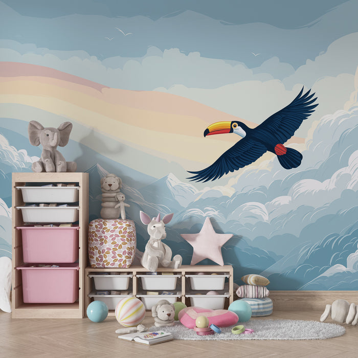 Kinderzimmer Tapete | Ein fliegender Tukan über den Wolken