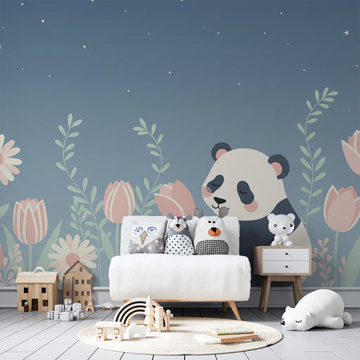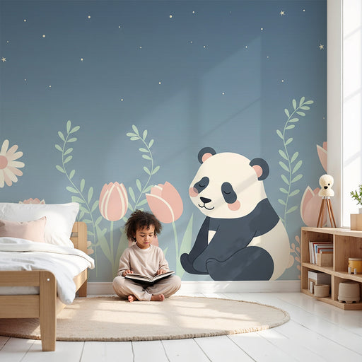 Babyzimmer Tapete | Niedlicher Panda umgeben von zarten Blumen