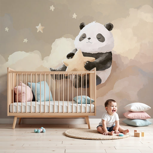 Babyzimmer Tapete | Niedlicher Panda auf neutralem Hintergrund mit glitzernden Sternen