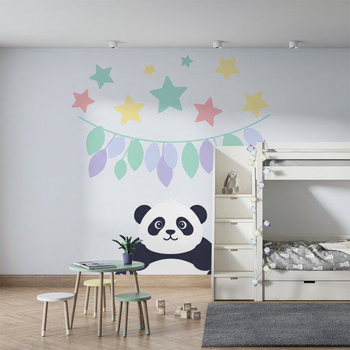 Babyzimmer Tapete | Niedlicher Panda mit pastellfarbenen Sternen und zartem Laubwerk