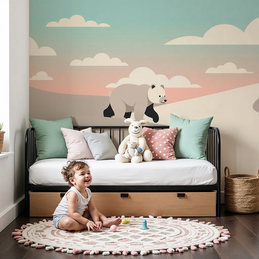 Babyzimmer Tapete | Niedlicher Panda in einer Pastelllandschaft