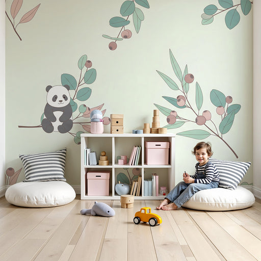 Babyzimmer Tapete | Niedlicher Panda umgeben von Pastellblättern