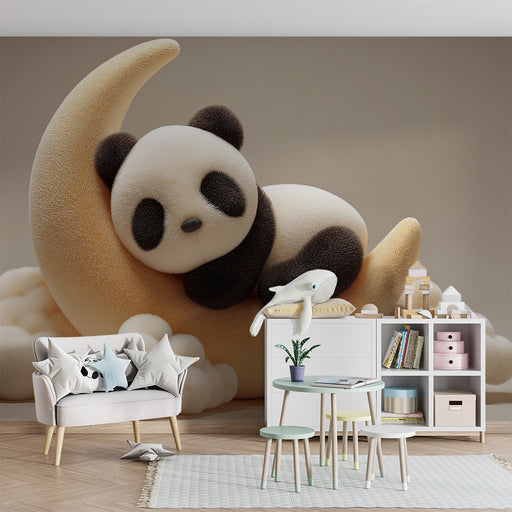 Verwandeln Sie das Zimmer Ihres Babys in eine märchenhafte Welt mit dieser Babyzimmer Tapete, die einen niedlichen schlafenden Panda zeigt, der san...