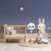 Babyzimmer Tapete | Panda und Hase unter einem Sternenhimmel mit bunten Blumen