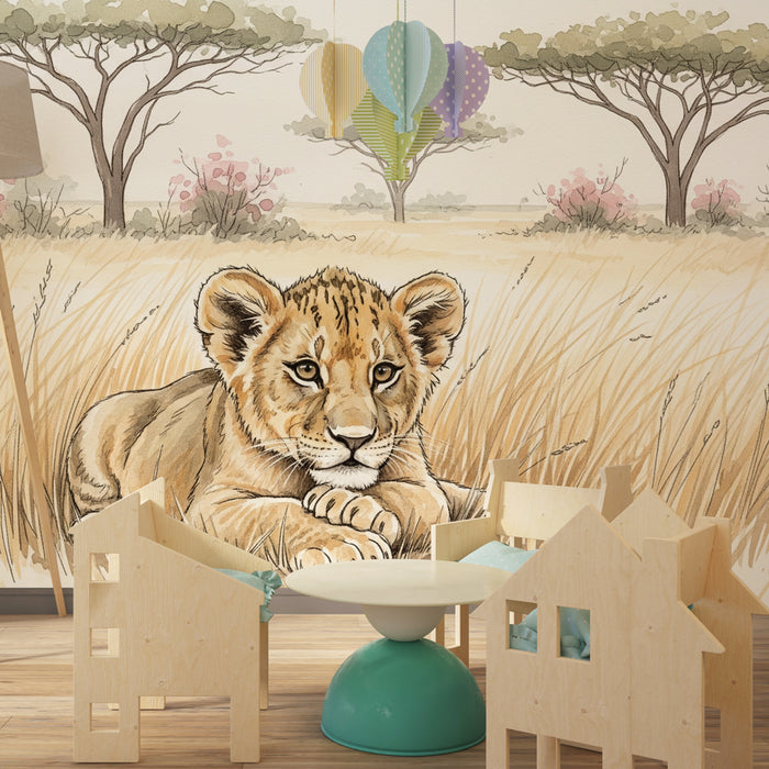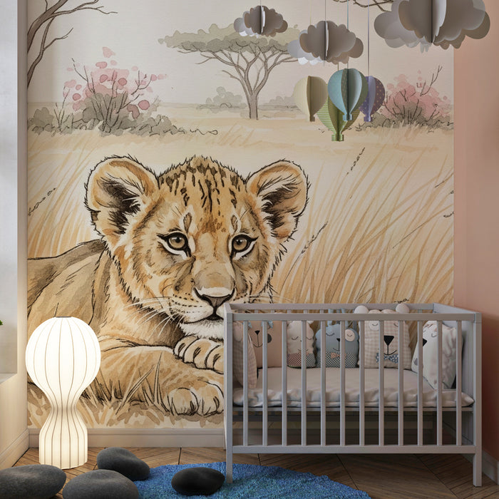 Kinderzimmer Tapete | Baby Löwe in der Savanne