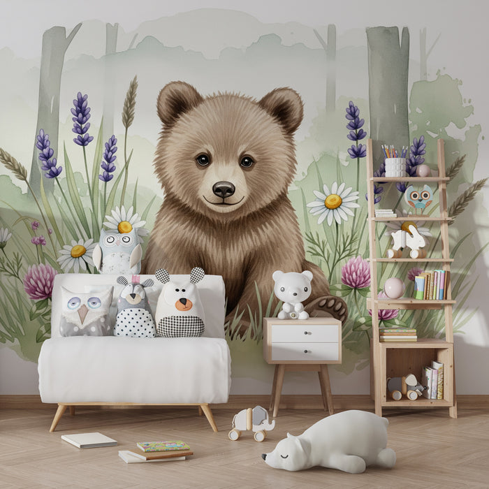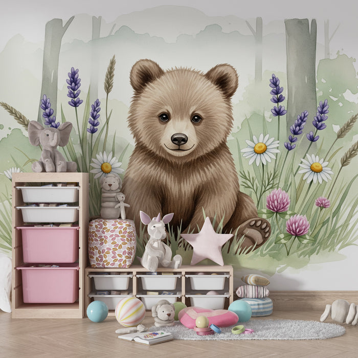 Kinderzimmer Tapete | Niedlicher Bär inmitten von Blumen
