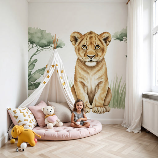 KidsWallTauchen Sie Ihr Kind in eine wilde und faszinierende Welt mit dieser Tapete für das Kinderzimmer ein, die ein entzückendes Löwenjunges zeigt, das d...