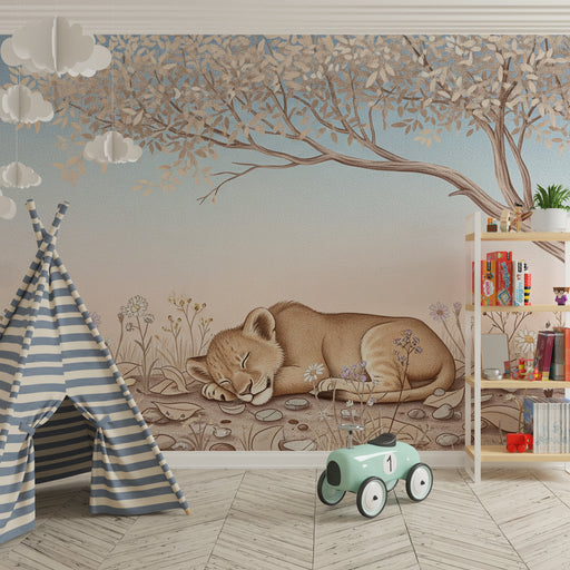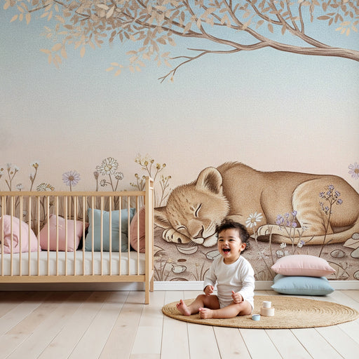Vollständige Details anzeigenKinderzimmer Tapete | Friedlicher Löwenjunges unter einem Baum