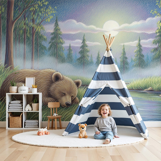 KidsWallNeugestalten Sie das Zimmer Ihres Kindes mit dieser Kinderzimmer Tapete, die einen friedlich schlafenden Bären am Ufer eines Flusses zeigt. Umgeben...