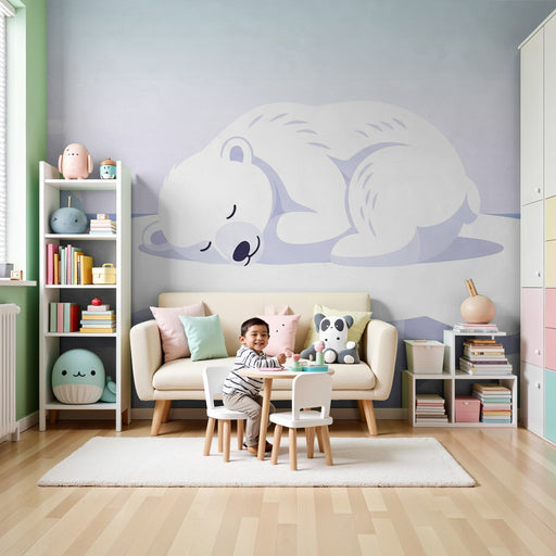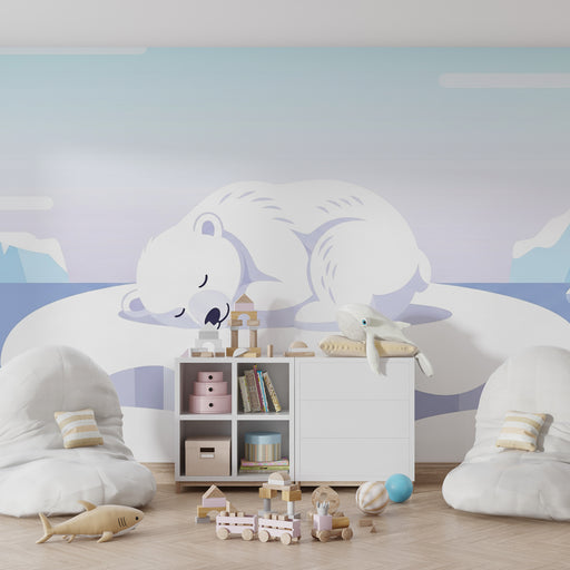KidsWallBringen Sie Ihr Kind in eine eisige und faszinierende Welt mit dieser Kinderzimmer Tapete, die einen friedlich schlafenden Eisbären auf einem Eisbe...