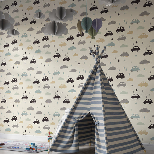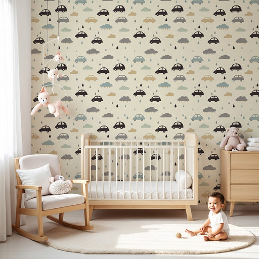 Kinderzimmer Tapete mit Mustern | Bunte Autos und fröhliche Wolken