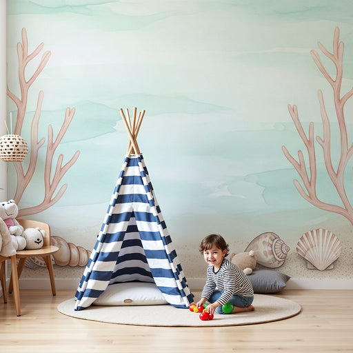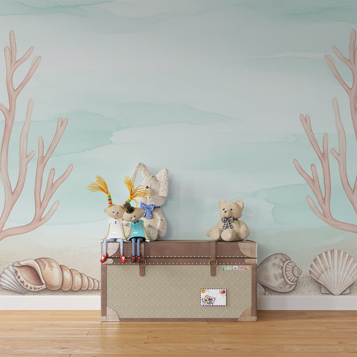 Vollständige Details anzeigenBabyzimmer Tapete | Beruhigendes Meeresuniversum mit Korallen und Muscheln