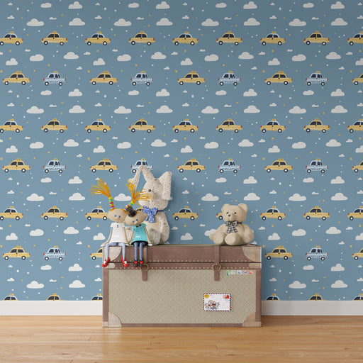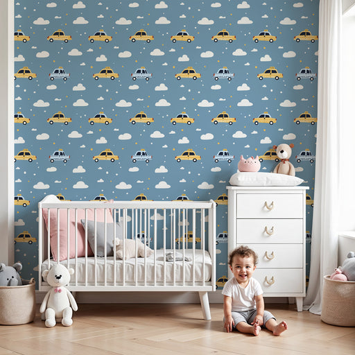 Kinderzimmer Tapete mit Muster | Bunte Autos unter einem bewölkten Himmel