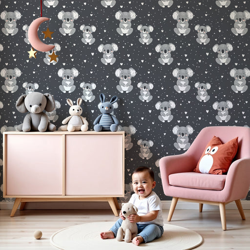 KidsWallFügen Sie mit dieser Kinderzimmer Tapete eine zarte Note in das Zimmer Ihres Kindes ein, die bezaubernde Koalas auf einem eleganten schwarzen Hinte...