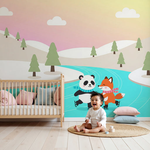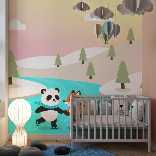 Vollständige Details anzeigenKinderzimmer Tapete | Fuchs und Panda Schlittschuh laufen auf dem Eis