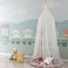 Die Pastellfarben und sanften Formen schaffen eine beruhigende Atmosphäre, ideal zum Schlafen und Träumen. Die Hügel im Hintergrund verleihen eine Dimension der Ruhe, während die schwebenden Wolken diese bezaubernde Landschaft vervollständigen. Jedes Detail ist darauf ausgelegt, die Fantasie Ihres Kindes anzuregen und es zu fantastischen Geschichten einzuladen.