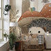 Die sanften und natürlichen Nuancen von Blättern und Bäumen verleihen einen rustikalen Touch, während der lächelnde Igel eine warme und fröhliche Note hinzufügt. Jedes Detail ist sorgfältig gestaltet, um die Fantasie Ihres Kindes zu wecken und es in märchenhafte Abenteuer zu entführen.