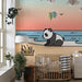 Verwandeln Sie das Zimmer Ihres Kindes mit dieser Kinderzimmer Tapete, die einen entzückenden Panda zeigt, der einen wunderschönen Sonnenuntergang am Strand betrachtet. Mit sanften und beruhigenden Farben ruft diese Illustration eine traumhafte und entfliehende Atmosphäre hervor.