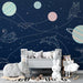 Χαρτί τοίχου παιδικού δωματίου | Αστρικό σύμπαν με αστερισμούς και πολύχρωμους πλανήτες