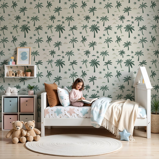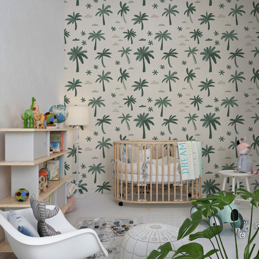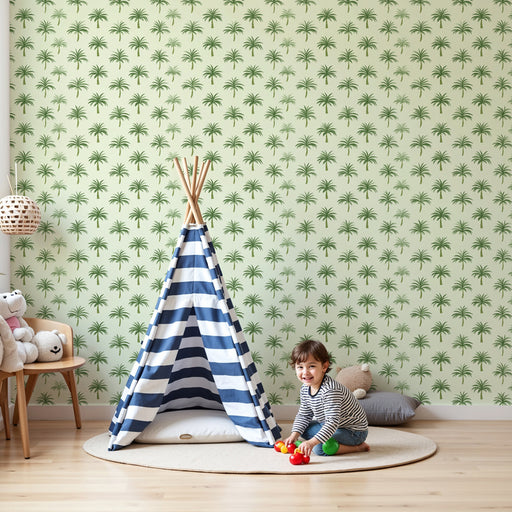 KidsWallΦέρτε μια τροπική πινελιά στο παιδικό δωμάτιο με αυτό το ταπετσαρία με μοτίβο φοίνικα. Το λεπτό και επαναλαμβανόμενο σχέδιο μικρών πράσινων φοίνικω...