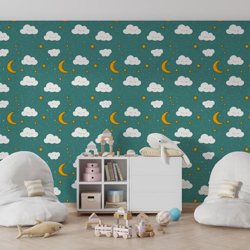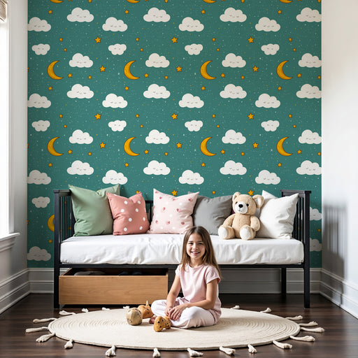 KidsWallΔημιουργήστε έναν χώρο γαλήνης για το παιδί σας με αυτό το χαρτί τοιχοποιίας για το παιδικό δωμάτιο, διακοσμημένο με απαλά σύννεφα και ημισέληνα σε...