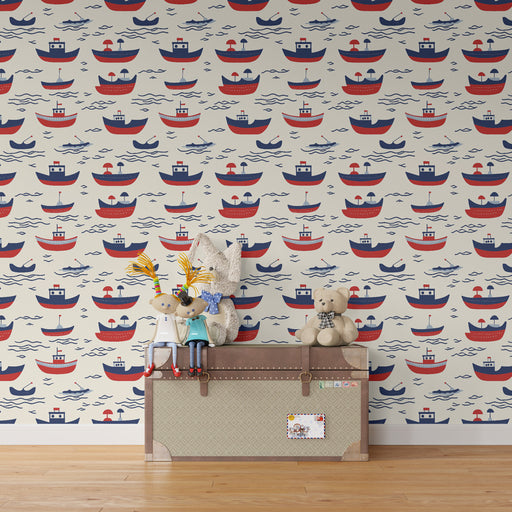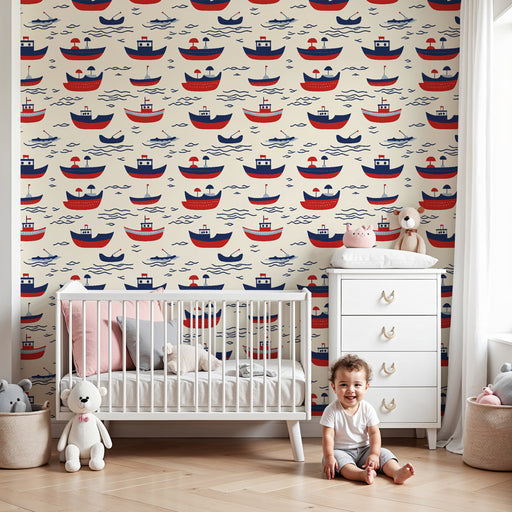 Εμφάνιση όλων των λεπτομερειώνΧαρτί τοίχου παιδικού δωματίου με μοτίβα | Μικρά πολύχρωμα βαρκάκια στη θάλασσα