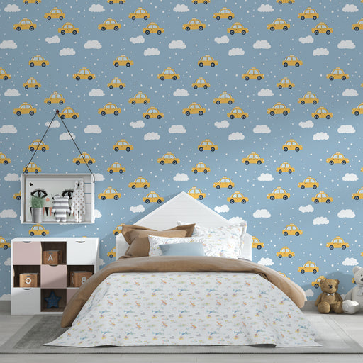 Εμφάνιση όλων των λεπτομερειώνΧαρτί τοίχου παιδικού δωματίου με σχέδιο | Κίτρινα ταξί σε μπλε φόντο