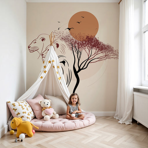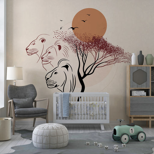 KidsWallΑνακαλύψτε την άγρια ομορφιά της σαβάνας με αυτό το ταπετσαρία για παιδιά που απεικονίζει μαγευτικούς λιοντάρια κάτω από ένα χρυσαφένιο ηλιοβασίλεμ...