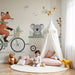 Χαρτί τοίχου παιδικό δωμάτιο | Αλεπού με ποδήλατο με τους φίλους του ζώα σε πολύχρωμα καρότσια