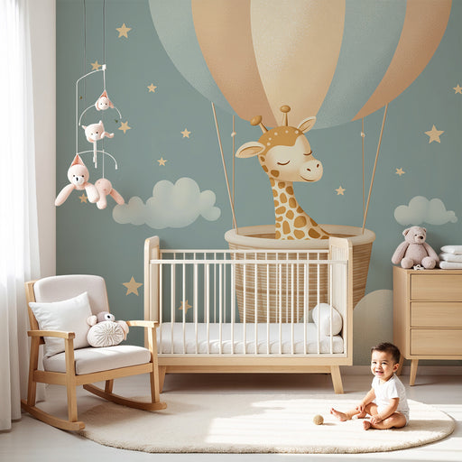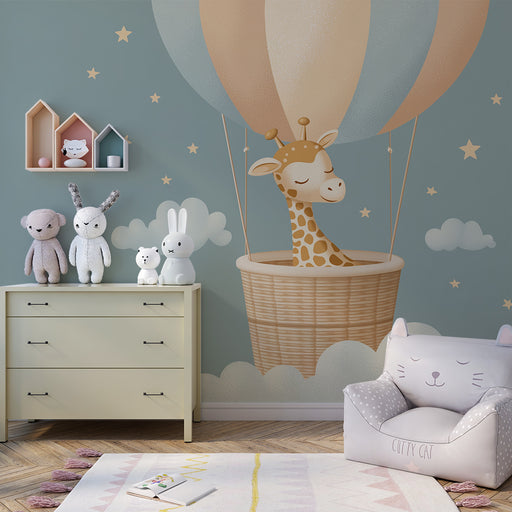 KidsWallΕπιβιβαστείτε σε μια γλυκιά και ποιητική περιπέτεια με αυτό το ταπετσαρία δωματίου μωρού που απεικονίζει μια αξιαγάπητη καμηλοπάρδαλη σε μια αερόσφ...