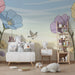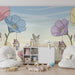 Ταπετσαρία για το δωμάτιο του μωρού | Έγχρωμα λουλούδια και σπίτια που αιωρούνται σε έναν απαλό ουρανό